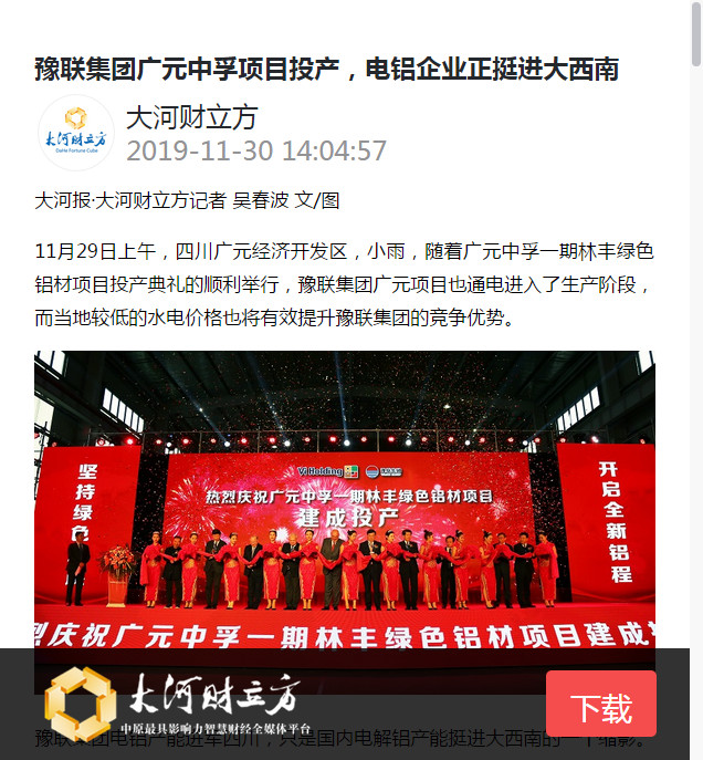 連日來,豫聯(lián)集團(tuán)廣元中孚一期林豐綠色鋁材項(xiàng)目建成投產(chǎn)的消息被中華人民共和國中央人民政府網(wǎng)、新華社、新華網(wǎng)、人民網(wǎng)、中國證券網(wǎng)、中國有色金屬報(bào)、河南日報(bào)、鞏義市人民政府網(wǎng)等眾多主流媒體廣泛宣傳、轉(zhuǎn)載報(bào)道。