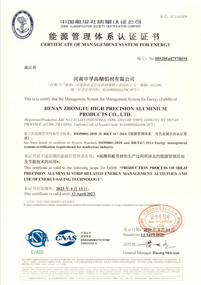 近日,中孚高精鋁材公司收到了中國船級社質(zhì)量認證公司頒發(fā)的《能源管理體系認證證書》,標志著公司建立的能源管理體系符合標準ISO50001:2018及RB/T 117-2014《能源管理體系有色金屬企業(yè)認證要求》。
